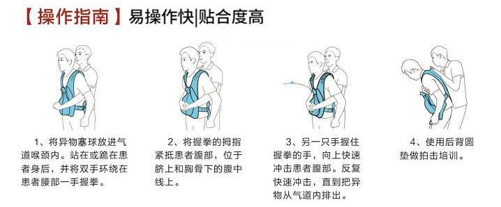 救援培訓專用窒息梗塞急救實訓穿戴馬甲,可有效避免因窒息急救不及時導致生命安全受到傷害。防窒息急救教育和實訓的時候,穿戴在學員身上,針對異物造成的呼吸氣道堵塞狀況時,練習腹部按壓(即海姆立克手法),做出正確步驟處理,擠出堵塞氣道異物(異物塞).直觀的教學模式給學員帶來自信和應用實效。模擬者可采用站姿、坐姿、用教具或借助柜臺、桌椅,實習體驗窒息自救、急救、達到救人一命的教學目的。