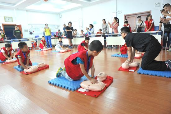 小記者們在120指揮大廳看到工作人員正在接聽電話,急救中心工作人員說,撥打120急救的每通電話都會接聽到這里,每接到一通電話,就是挽救生命的開始。為了縮短搶救時間,一定要注意說清地址、病人癥狀、保持電話通暢。小記者們屏住呼吸認真聆聽,后還體驗了一把模擬接警。隨后,小記者們跟著工作人員一起學習心肺復蘇技能,四個人一組,在模擬仿真人上操作心外按壓和人工呼吸。家長們也加入進來,和孩子共同學習,向老師請教。此次科普活動,小記者們不僅學到了許多知識,還明白了急救技能的重要性。