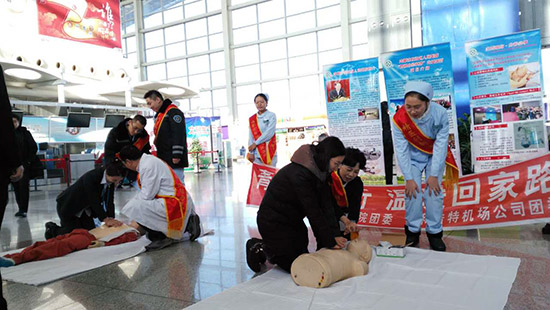 人民網呼和浩特1月13日電 13日春運進入天,上午九點,內蒙古自治區人民醫院團委與呼和浩特機場公司團委聯合啟動了“青春志愿行 溫暖回家路”主題活動在呼和浩特市飛機場大廳舉辦,F場集體宣誓服務春運、培訓機場青年掌握現場緊急救護知識,包括心肺復蘇、身體不同部位出血緊急止血方法、骨折病人搬運等。