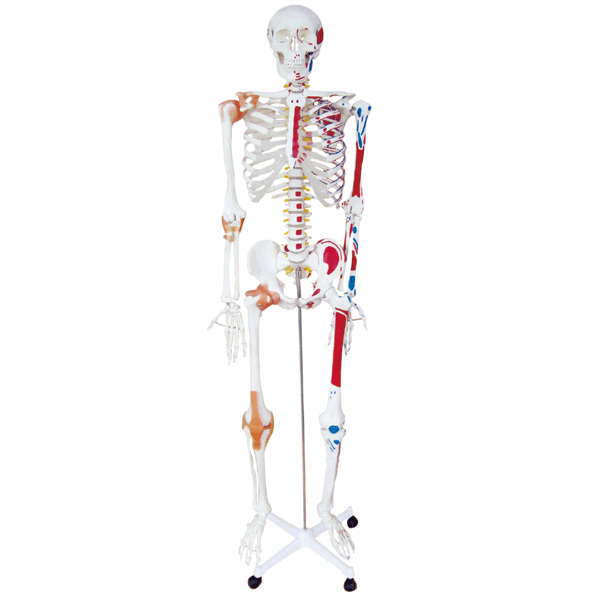 This natural size skeleton indicates muscle starting and ending area, 170cm height.On a base stand with roller. Made of High Quality PVC. Supplies with a dust cover.