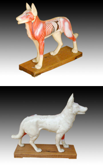 本模型顯示狗體左半部72個常用穴位,穴位用數字標注。右半部顯示解剖面。用PVC制成,供獸醫作參考用。