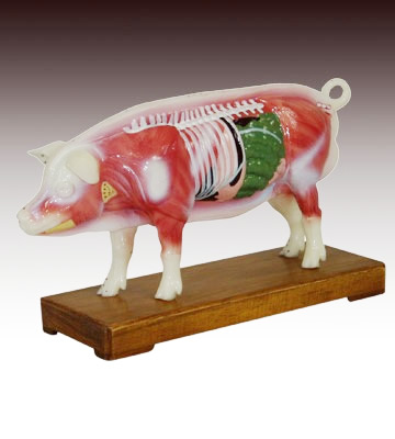 本模型右側示雄性上海大白豬的體形,以及自頭頸部、軀干、臀尾部和前后肢分布的常用針穴55個。左側示淺層肌肉,并切除體壁,示脊柱和內臟結構。用PVC制成,供獸醫作參考用。