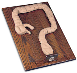 As the scope follows the contours of the large intestine, the student must negotiate the sigmoid colon, splenic flexure, and hepatic flexure before viewing the internal structure of the ascending colon and cecum. As the flexible sigmoidoscope is withdrawn, the student can identify benign sessile, pedunculated and hyperplastic polyps, as well as cancerous lesions. There are a total of 12 pathological conditions to diagnose. All manipulative and photographic techniques can also be practiced. Originally produced exclusively for ACMI, this simulator has been used for physician training nationwide. Life/form® Sigmoidoscopic Examination Simulator is available on a solid oak stand complete with lubricant, instruction guide, and hard carrying case. Three-year warranty. Size: 26" x 19" x 7".