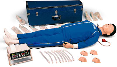 This manikin provides maximum student/instructor feedback in four practice modes: compression rate, compression depth, ventilation duration, and ventilation volume. Red light indicates improper hand placement. The performance of each skill is displayed separately while averages are stored in the memory. With the flip of a switch, memory unit evaluates performance based on child or adult CPR standards. The manikin with both memory and printer will print out test strips that plot and tabulate test performance skills indicating good, high, and low results in either adult or child mode. Power saver feature automatically turns unit off, but retains previous data. Low battery indicator. Three-year warranty.
