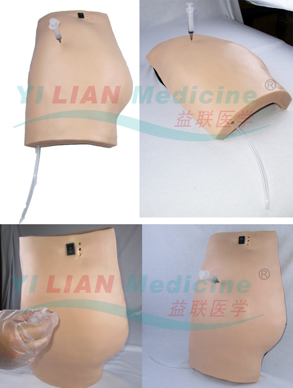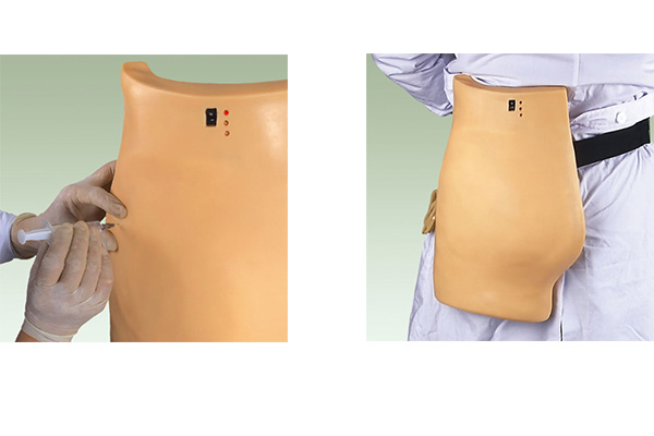 主要功能特點: ■ 該模型可穿在學員身上,適合兩個學生一組練習:一個充當護士,一個充當病人。 ■ 模擬仿真成人臀部結構,設計精巧輕便,與真實環境更加接近。皮膚質感非常逼真,進針痕跡不明顯 ■ 解剖位置精確,有電子報警顯示功能: 穿刺時,針頭正確插入正常部位,正確深度,燈光顯示綠色。 穿刺時,針頭刺入位置錯誤部位,燈光顯示紅色及電子報警。 穿刺時,針頭刺入的位置正確,深度過深,燈光顯示紅色綠色及電子報警。 ■ 注射部位正確時,允許注入模擬液體,由內部的排液管排出。